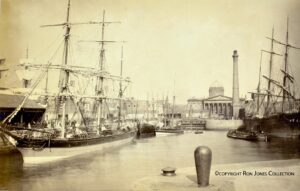 This late 19th century image shows the George’s Dock just before the end of its working life. Designed by dock engineer, Henry Berry and named